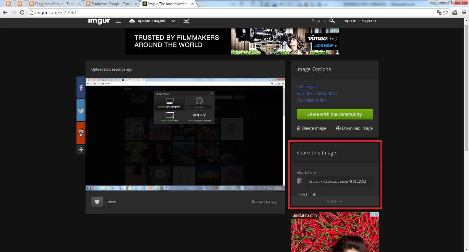 El enlace que debes compartir para que los demás usuarios puedan ver tu imagen es el que se encuentra en la casilla «Share Link» que se encuentra ubicado en la parte derecha de la pantalla bajo el titulo «Share this image«